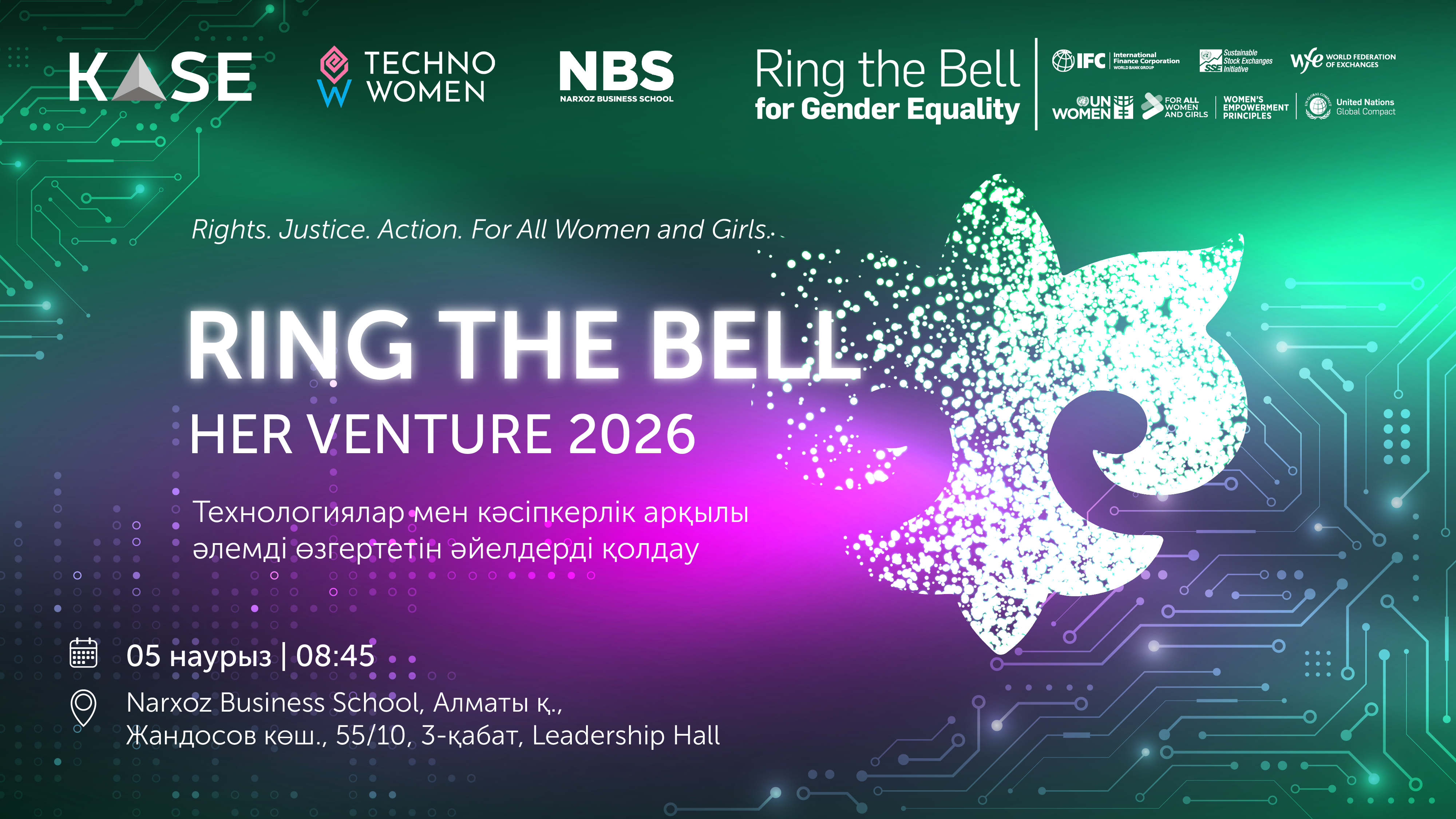 2026 жылғы 05 наурызда Қазақстан қор биржасы (KASE) БҰҰ-ның “Тұрақты қор биржалары” (UN SSE) жаһандық бастамасына және “Rights. Justice. Action. For ALL Women and Girls” тақырыбына орай Ring the Bell for Gender Equality сауда-саттықты ашудың салтанатты рәсімін өткізеді.