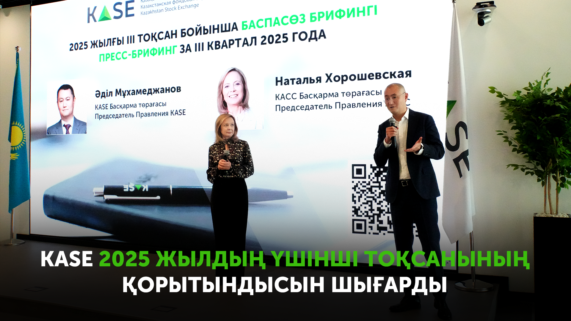 15 қазан күні өткен баспасөз брифингінде Қазақстан қор биржасының (KASE) Басқарма төрағасы Әділ Мұхамеджанов пен "KASE Клиринг орталығы" АҚ Басқарма төрағасы Наталья Хорошевская Биржа тобының 2025 жылдың үшінші тоқсаны мен тоғыз айындағы қызметінің нәтижесін ұсынды. Аталған кезеңнің қорытындысы бойынша келесі көрсеткіштер тіркелді: